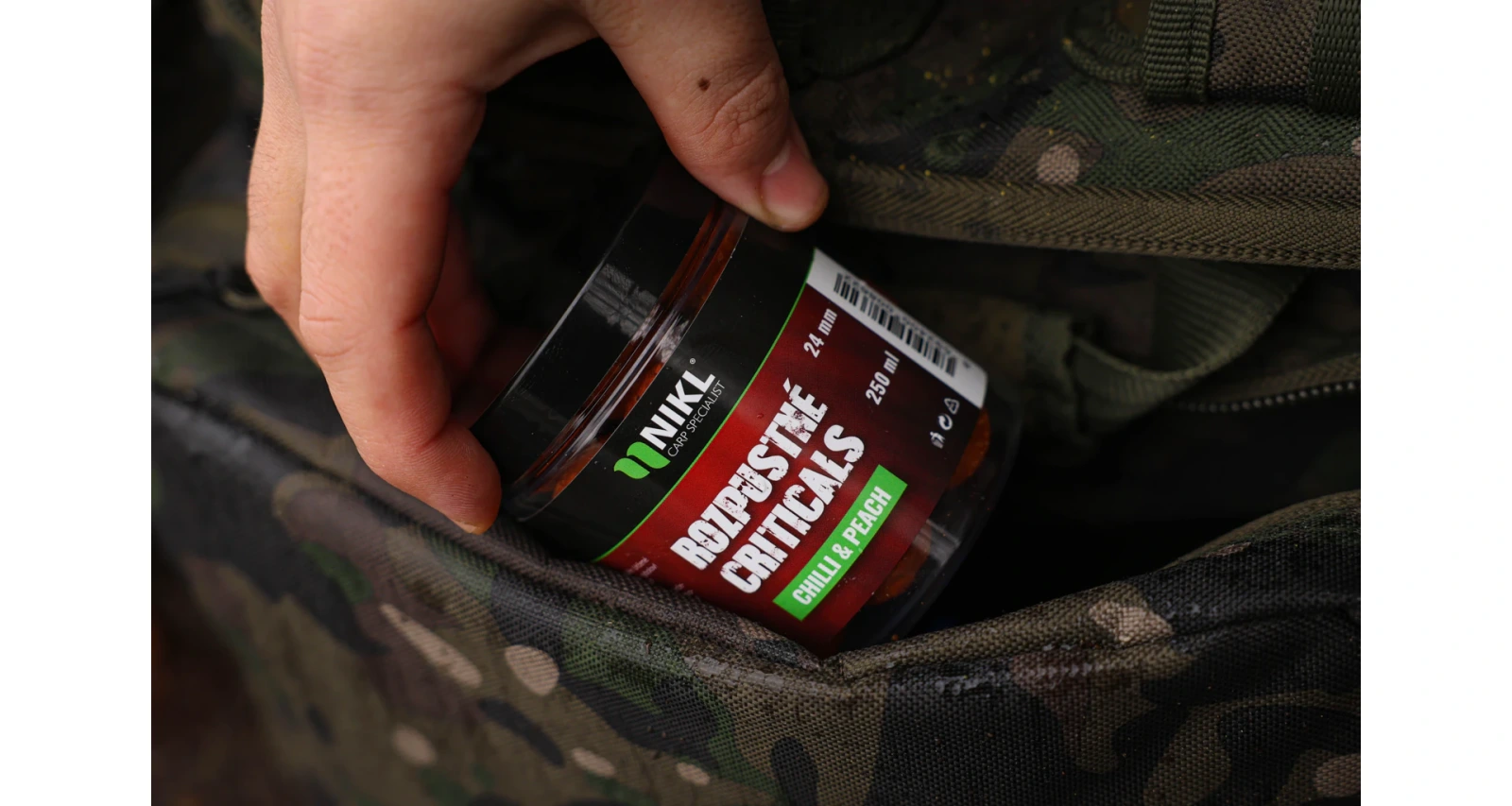 Rozpustné Criticals boilie Chilli & Peach v balení 250 ml. Skvělá nástraha určená výhradně pod háček, navržená pro záběr v co nejkratším čase. Po několika minutách ve vodě se začne pozvolna rozpouštět a uvolňovat esence, atraktory a moučky, což je pro kapry velmi přitažlivé a často způsobí, že při krmení sáhnou po nástraze dříve než po ostatním krmení. Kolem montáže postupně vytváří stabilní potravní signál, který se šíří přirozeně a drží pozornost ryb přímo u nástrahy i v náročných podmínkách nebo na tlakových vodách. Kombinace pikantního chilli a sladké broskve nabízí výrazný, kontrastní profil a díky průběžnému uvolňování složek zůstává prezentace dlouhodobě účinná, když potřebujete rychlou reakci. Kuličky jsou odlehčené drceným korkem, takže jsou kriticky vyvážené a zůstávají lehce nad dnem, což usnadňuje nasátí a často rozhoduje u opatrných kaprů. Ideální pro závodní rybařinu, kdy rozhodují minuty; průměry: 14, 18 a 24 mm, balení: 250 ml.
